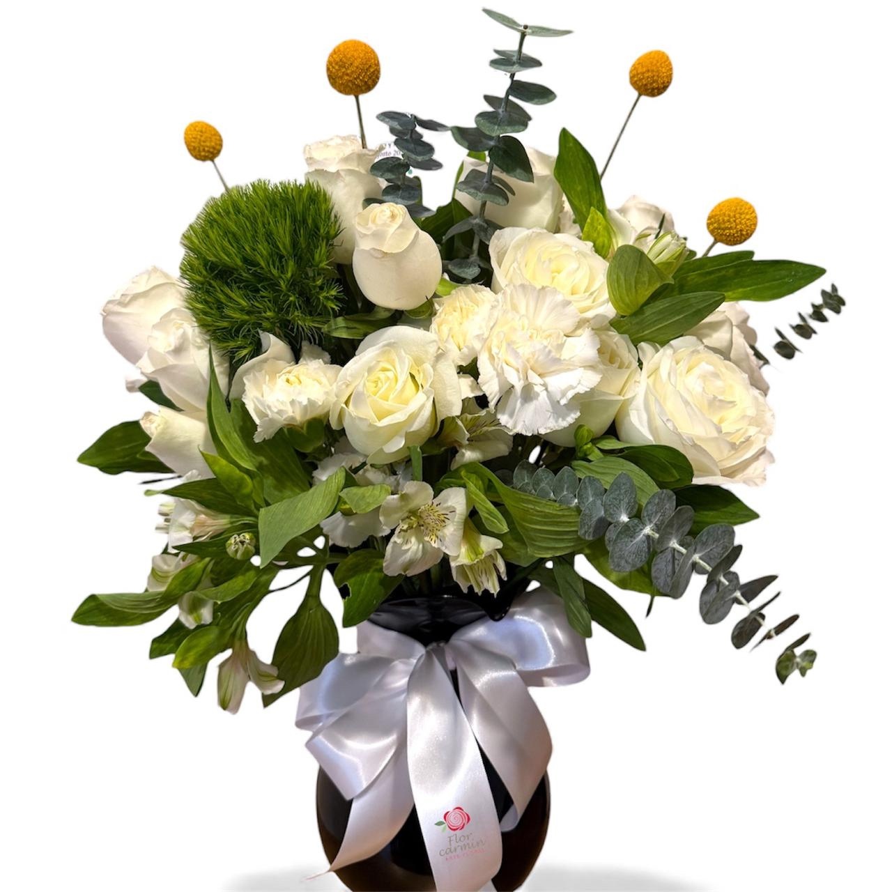 24 rosas, alstromelia, green peek, craspedia, eucalipto en jarron de cristal negro chico