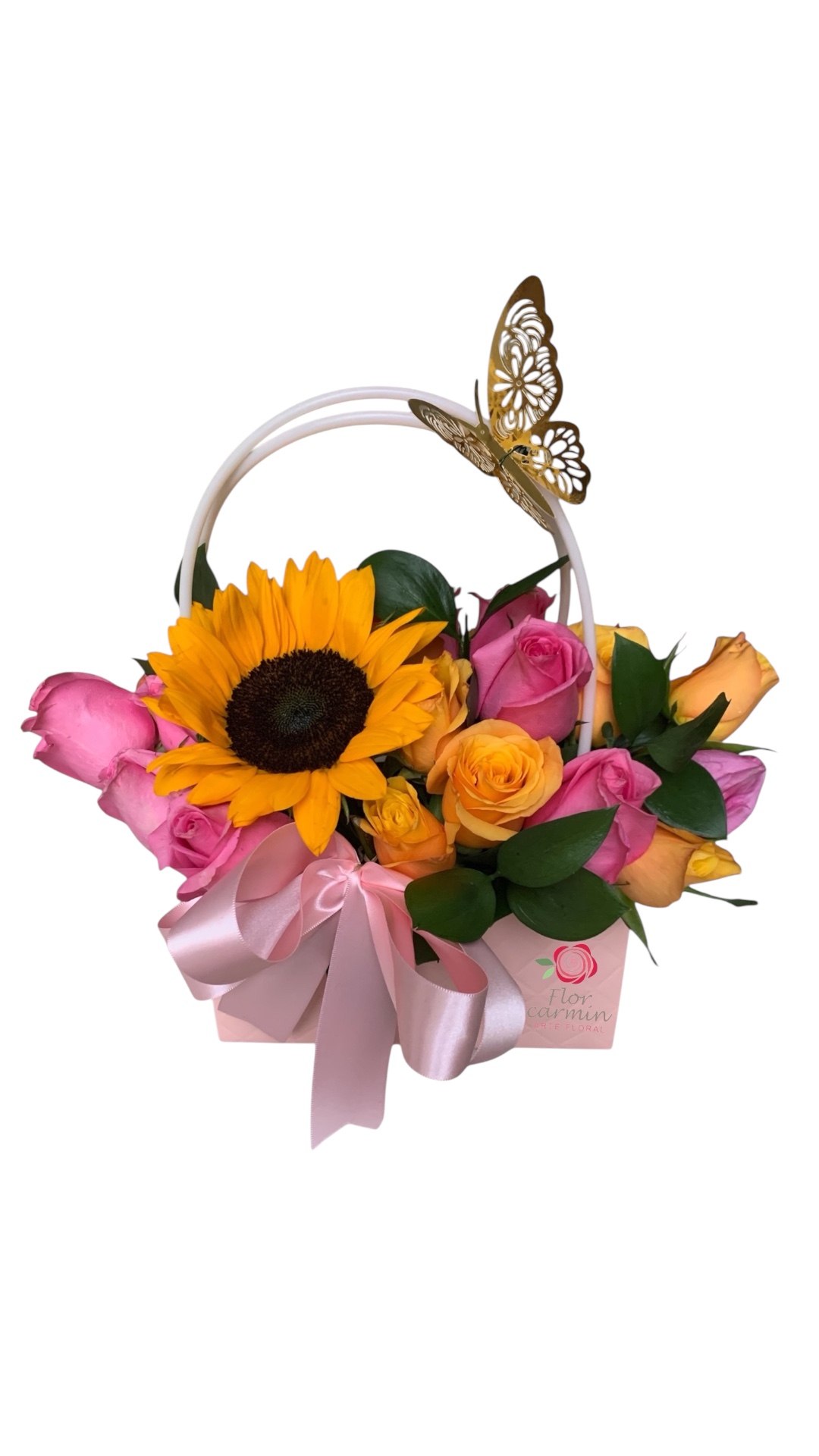 En bolsa rosa especial para flores, con accesorio de Mariposa
