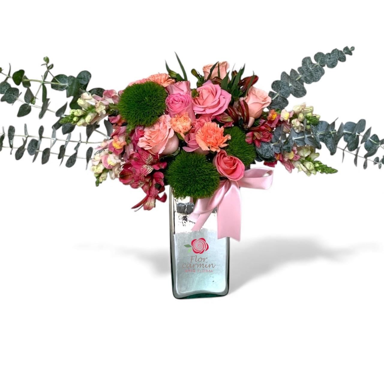 24 Rosas, dragonaria, alstromelias, greenpeek, clavel, eucalipto en base cuadrado de espejo chico