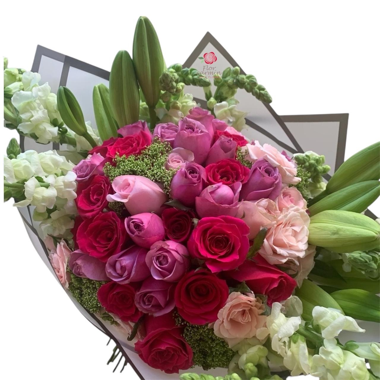 Bouquet de 24 rosas, mini rosas, traquelum, antirrihum y lilis en papel coreano