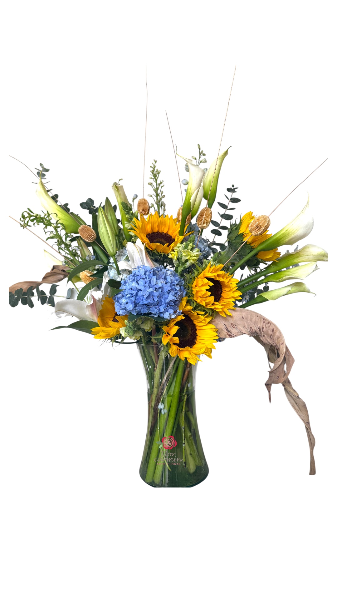 Girasoles, alcatraces, orientales, hortencias, eucalipto y elementos preservados